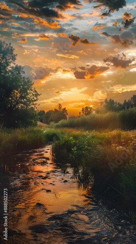 © Paul, Fototapeta premium Paisaje del campo y un rio al atardecer imagen vertical