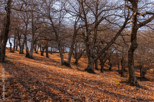 Fototapeta premium paisaje otoñal de montaña con los castaños sin hojas Andalucía España