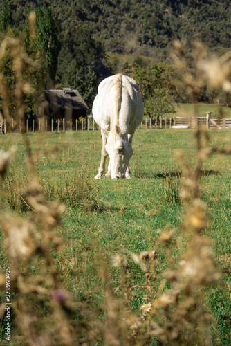 © JuanManuel, Obraz premium Paisajes de praderas en la Patagonia Argentina con increíbles valles en zona rural. Vacas, caballos y ovejas pastando se pueden apreciar.
