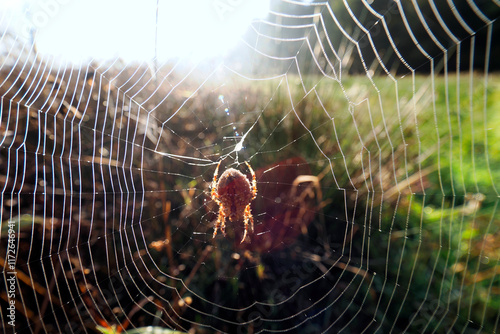Fototapeta premium Pająk krzyżak – z rodziny krzyżakowatych (Araneidae) jest pięknym i znanym pająkiemna owłoku jest znak podobny do krzyża.