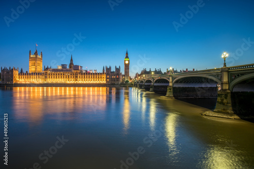 Fototapeta premium Palace of Westminster with Big Ben and Westminster Bridge at night, London,...