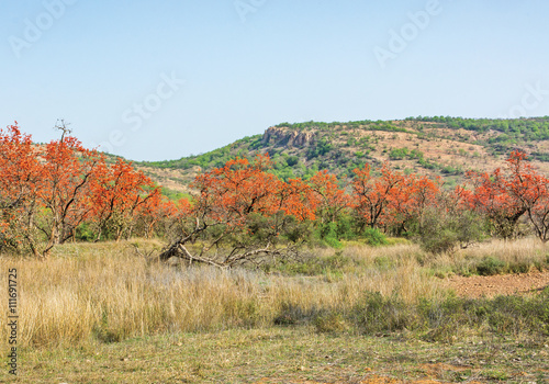 © s4sanchita, Obraz premium palash trees with red blooms in Ranthambhore national Park, Rajasthan, India
