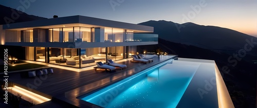 Fototapeta premium Palatial modern villas with large glass walls and shimmering infinity pools...