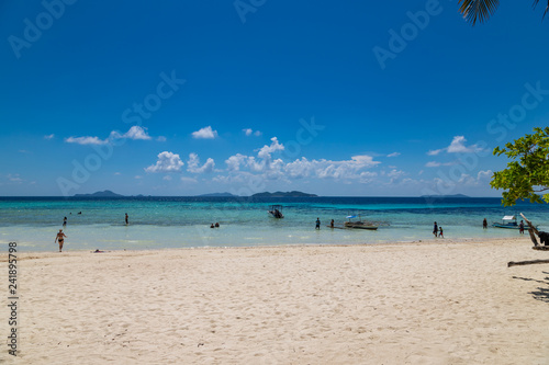 © umike_foto, Fototapeta premium PALAWAN / PHILIPPINES - NOVEMBER 01, 2018: Tropical background view from Malcapuya island with traditional philippines boats and swimming tourists. Travel vacation at Philippines.