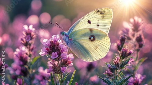 Naklejka premium Pale butterfly on pink flowers in sunlight.