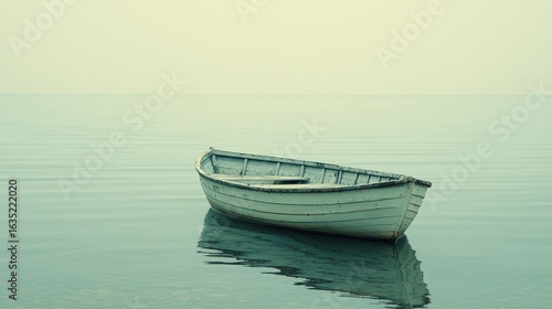 Naklejka premium Pale, empty rowboat on a still, misty lake