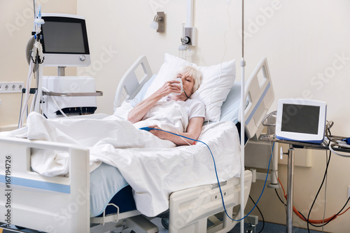 Obraz premium Pale fragile woman trying breathing without oxygen mask