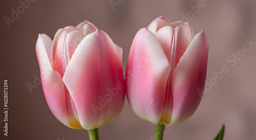© Artonic, Naklejka premium Pale Pink Tulip Blossoms Leaning Together on Dusty Rose Background