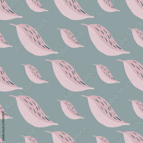 Fototapeta premium Pale seamless stylized pattern with leaves shapes. Abstract botanic figures in pink color on blue background.