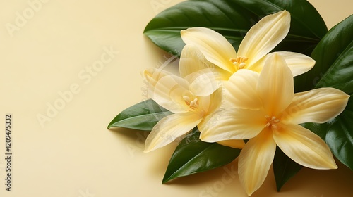 © Nizar, Obraz premium Pale Yellow Flowers Resting on Lush Green Leaves