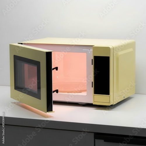 © Ariestia, Fototapeta premium Pale yellow retro style kitchen appliance door stands open revealing an illuminated interior
