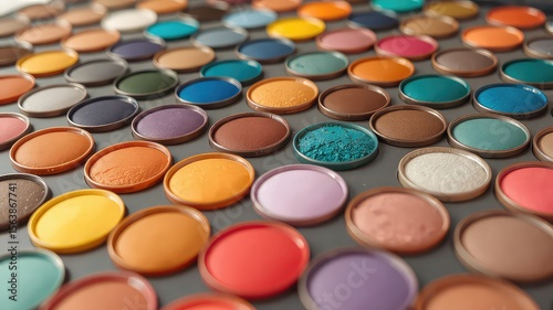 Naklejka premium Palette of vibrant cosmetic powders arrayed in a grid pattern creates a...