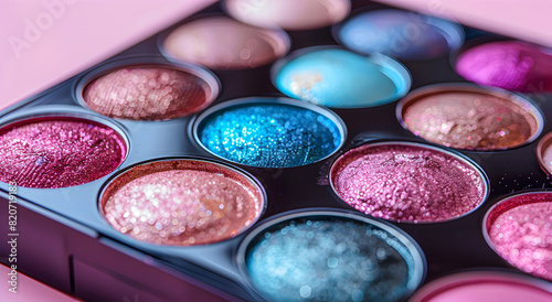 © LK , Naklejka premium Palette with multicolored cosmetic eyeshadows for women. On a delicate background.
