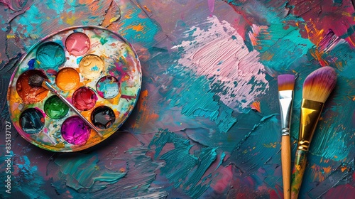 © สมชัย ้พาลแก้ว, Fototapeta premium Palette with paints and brushes on colorful background, top view