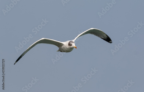 © Abhishek Mittal, Obraz premium Pallas Gull (Ichthyaetus ichthyaetus) bird in flight over river Ganges in Haridwar, India