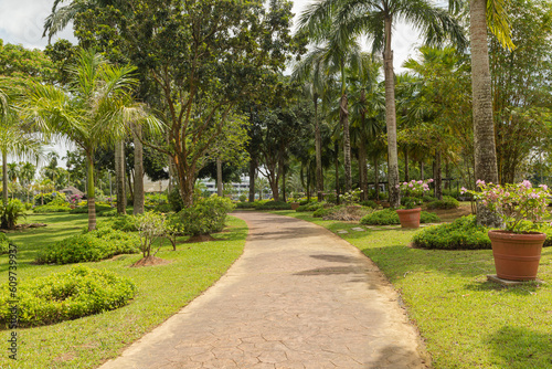 Fototapeta premium Palm collection in сity park in Kuching, Malaysia, tropical garden with large trees and lawns.