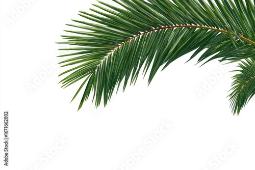 Naklejka premium Palm frond detail Lush green leaves arch over a stark white backdrop. Branch...