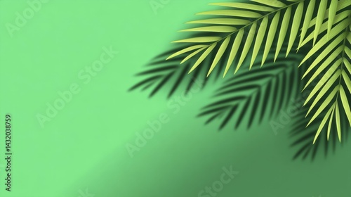 © Dari, Obraz premium Palm fronds and shadows over a plain green surface offer ample space for text or graphics, ideal for a summery or tropical feel.