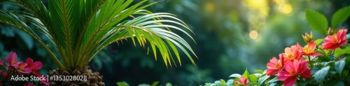 © Phennapha, Naklejka premium Palm fronds cluster on a slender trunk surrounded by vibrant flowers and lush foliage , tropical, branches, jungle