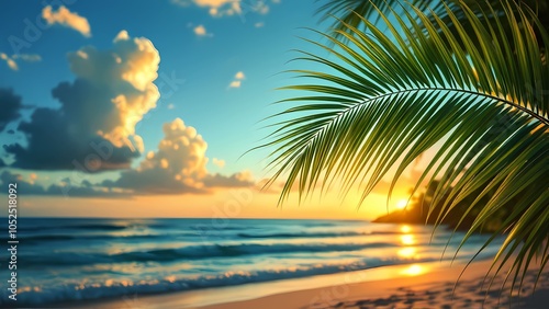Naklejka premium Palm Leaf at Sunset with Relaxed Mood on Tropical Beach