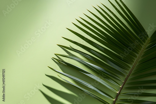 Obraz premium Palm leaf casting shadow on green background with copy space