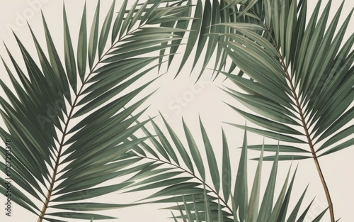 Obraz premium Palm leaf pattern. Close-up of palm leaves in a symmetrical pattern, featuring a minimalistic background. This pattern is perfect for a tropical aesthetic.
