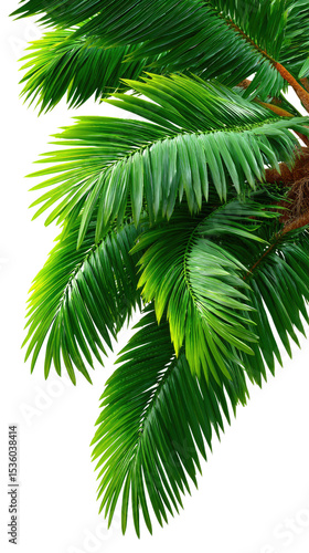 Naklejka premium Palm Leaf Serenity: Lush, green palm leaves exude a sense of tranquility, their intricate fronds gently illuminated in a vibrant display of nature's artistry.