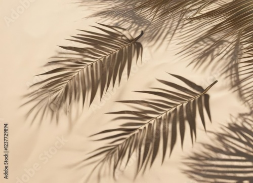Fototapeta premium Palm leaf shadows creating a unique design on a smooth sandy beach, serene,...