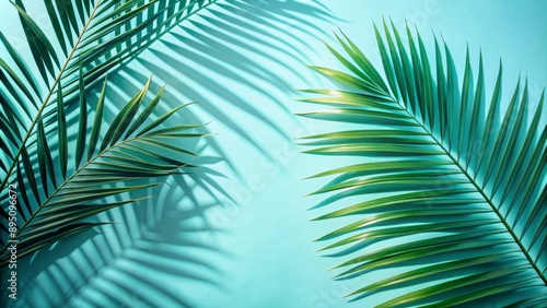 Fototapeta premium Palm Leaf Shadows on Turquoise Background, tropical, summer, greenery, nature