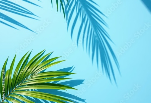 © ibhonk, Obraz premium Palm Leaf with Shadow on a Blue Background