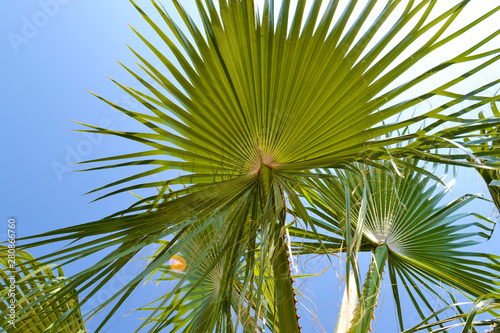 © Aleksandr, Fototapeta premium Palm leaves against the blue sky. Close-up