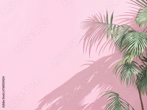 © REZAUL4513, Naklejka premium Palm leaves cast a hazy shade on the pale pink wall. abstract background with a minimum for showcasing products. summer and spring.