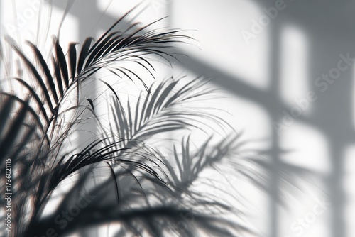 © pipa, Fototapeta premium Palm leaves cast shadows on a white wall, through window grids