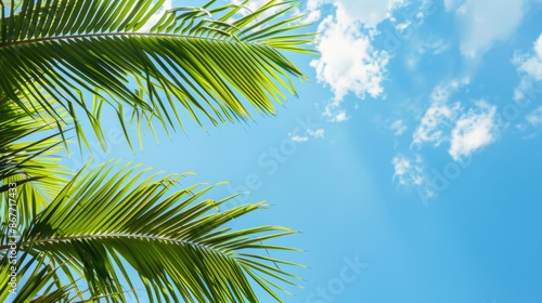 © tanibond, Fototapeta premium palm leaves on blue sky background --ar 16:9 --style raw Job ID: 77f4124b-67d5-467b-9b18-ca8c6a70cb5d