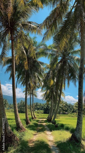 © Ferdi, Obraz premium Palm-lined path through vibrant green fields under a clear blue sky