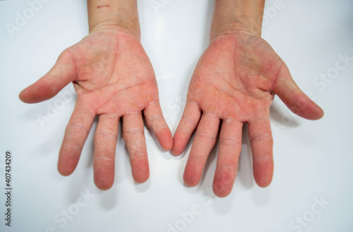 © Albert, Fototapeta premium Palm of the hand with skin disease on a white background
