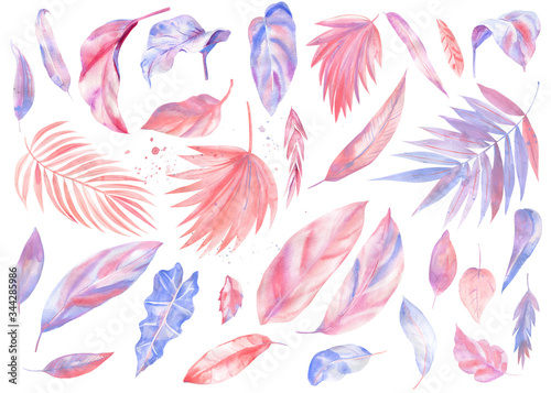 Fototapeta premium Palm pink leaves on isolated white background, watercolor illustration,...