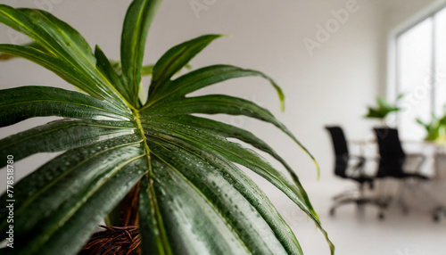 Fototapeta premium palm plant in modern office on background, selective focus, copy space