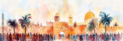 © Shutter2U, Obraz premium Palm Sunday with Jesus entering Jerusalem, a silhouette of a crowd with palm trees and ancient city, illustrated in watercolor