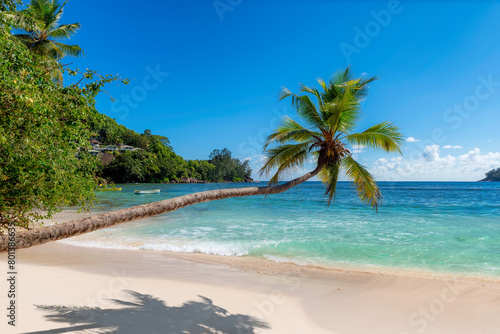 © lucky-photo, Obraz premium Palm tree above the beautiful beach in tropical island. Summer vacation and tropical beach concept.