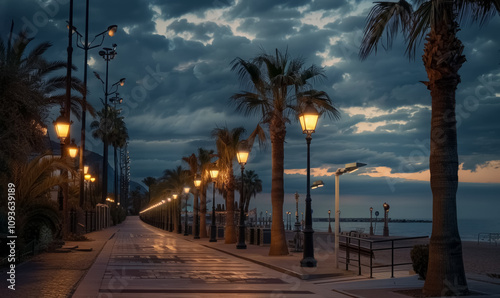 Obraz premium palm tree alley night at beautiful coastal town, tropical city illuminated...