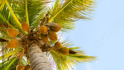 © Kletr, Naklejka premium Palm tree and coconuts. Picture from tropical beach with space for your text.