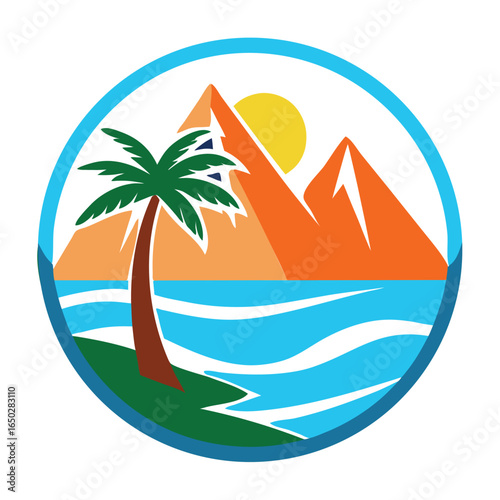 © Sahida, Fototapeta premium Palm Tree and Mountain Sunset Badge