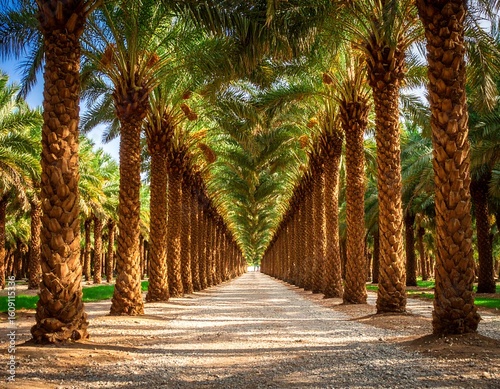 © tari, Obraz premium Palm tree avenue, sunlit path
