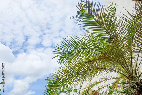 Naklejka premium Palm Tree branch with leaves in front of blue sunny sky, tree with green...