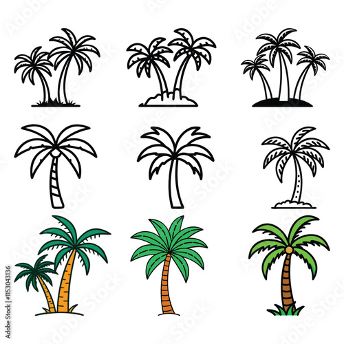 Fototapeta premium Palm Tree Icon Set: Outline and Color, A collection of nine palm tree icons in black-and-white outline and colorful styles, ideal for tropical, travel, and nature-themed designs.