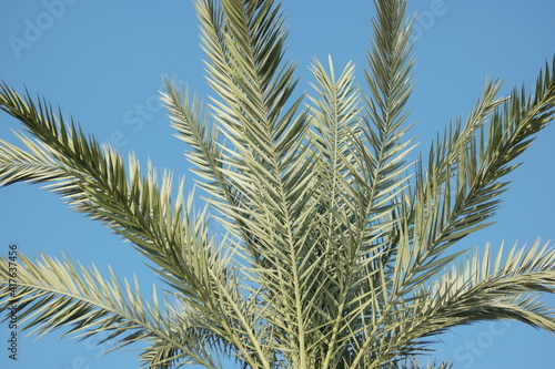 Fototapeta premium Palm tree leaves against blue sky background. Green branches of palm tree....
