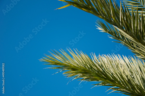 © altana_studio, Fototapeta premium palm tree leaves on blue sky background with copy space