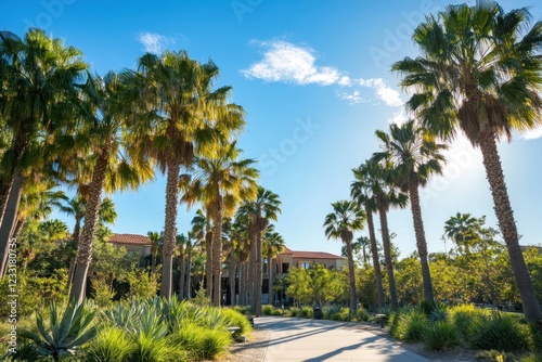 Obraz premium Palm Tree Lined Pathway at University Campus