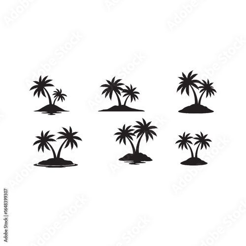 © Riasat, Obraz premium Palm Tree on Small Island Silhouette Vector for Tropical, Beach, and Vacation Concepts